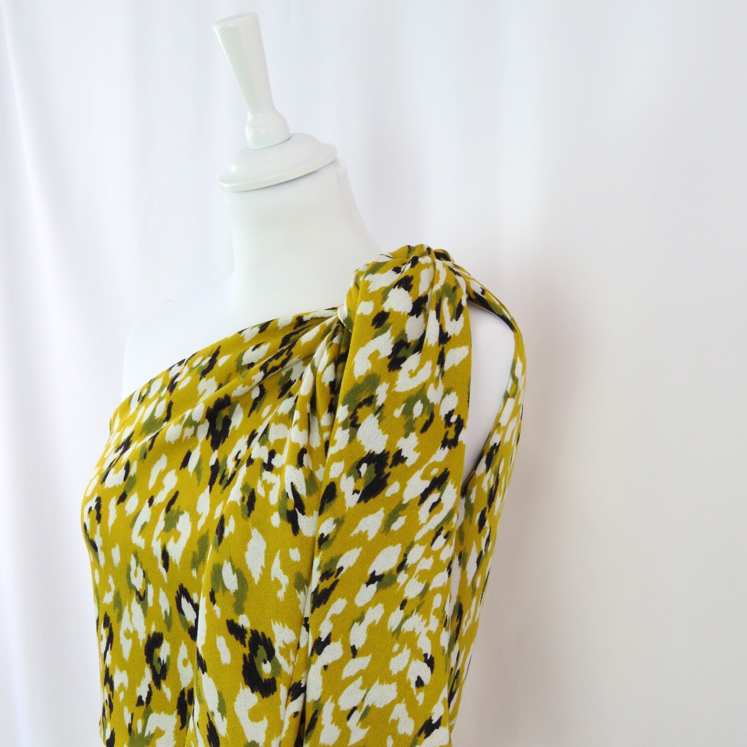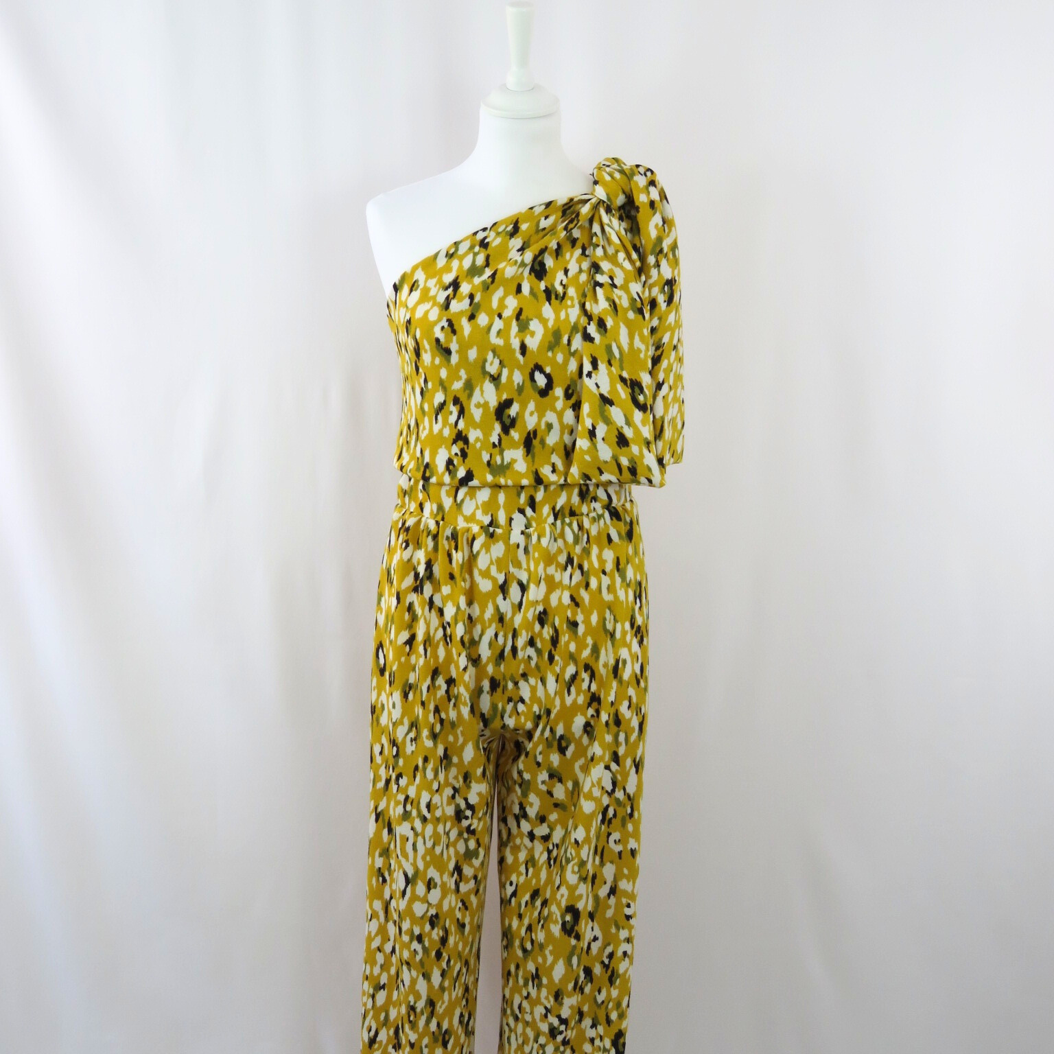 This one shoulder jumpsuit features a striking panther print and a flattering, flowy drape. The unique one shoulder design adds a touch of sophistication, while the tied bow and the slits at the bottom with straps adds a feminine touch. Make a statement with this sleek and stylish jumpsuit.