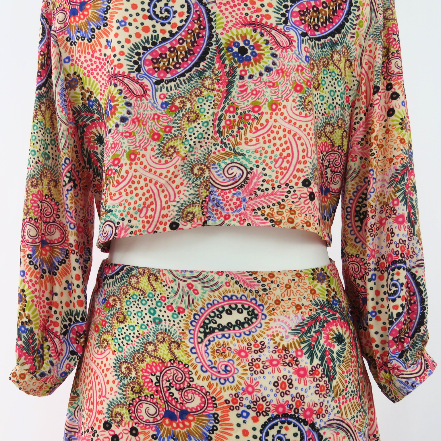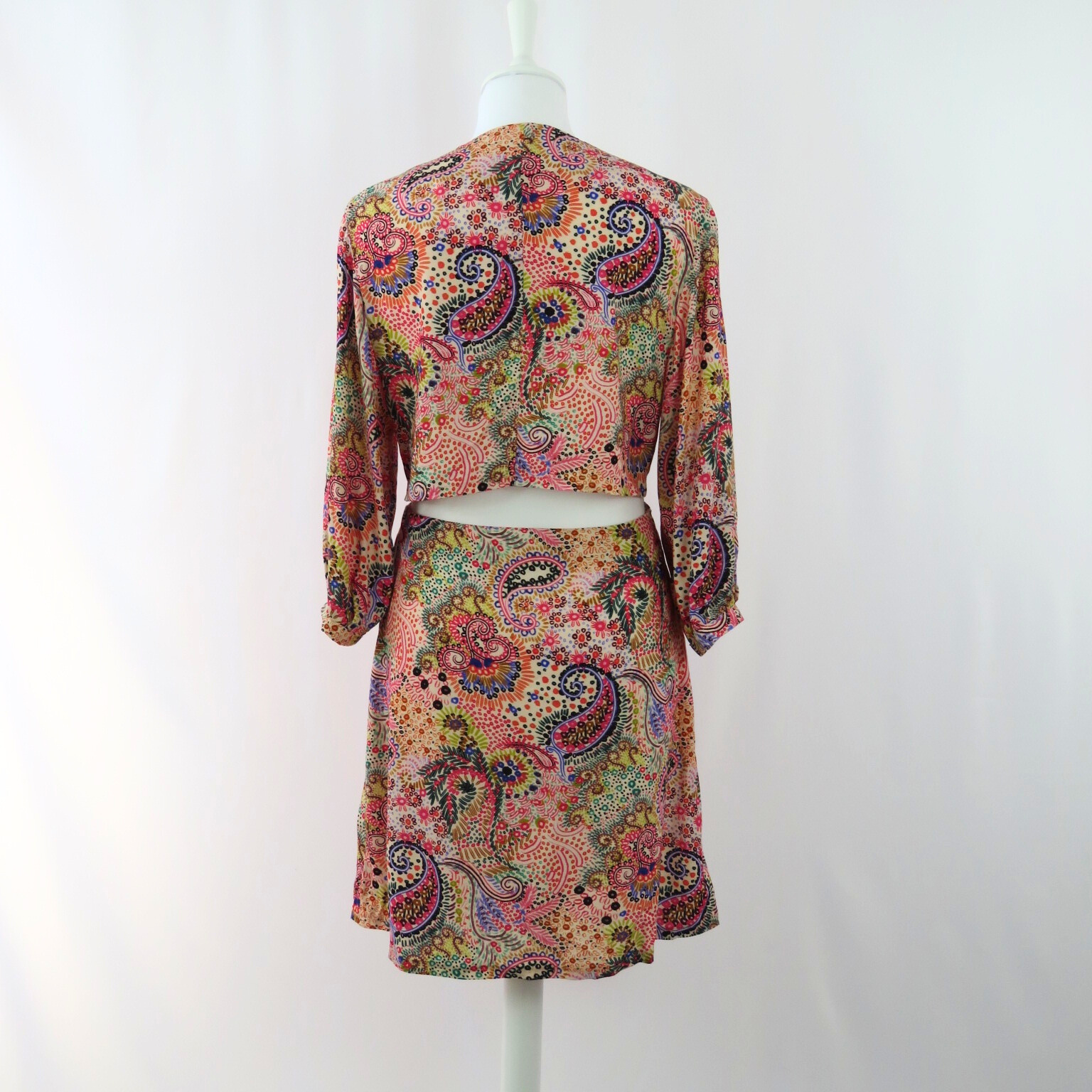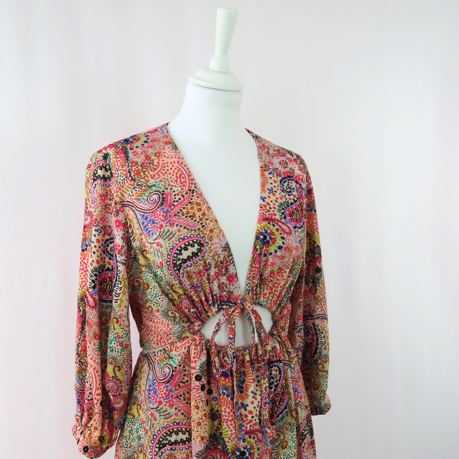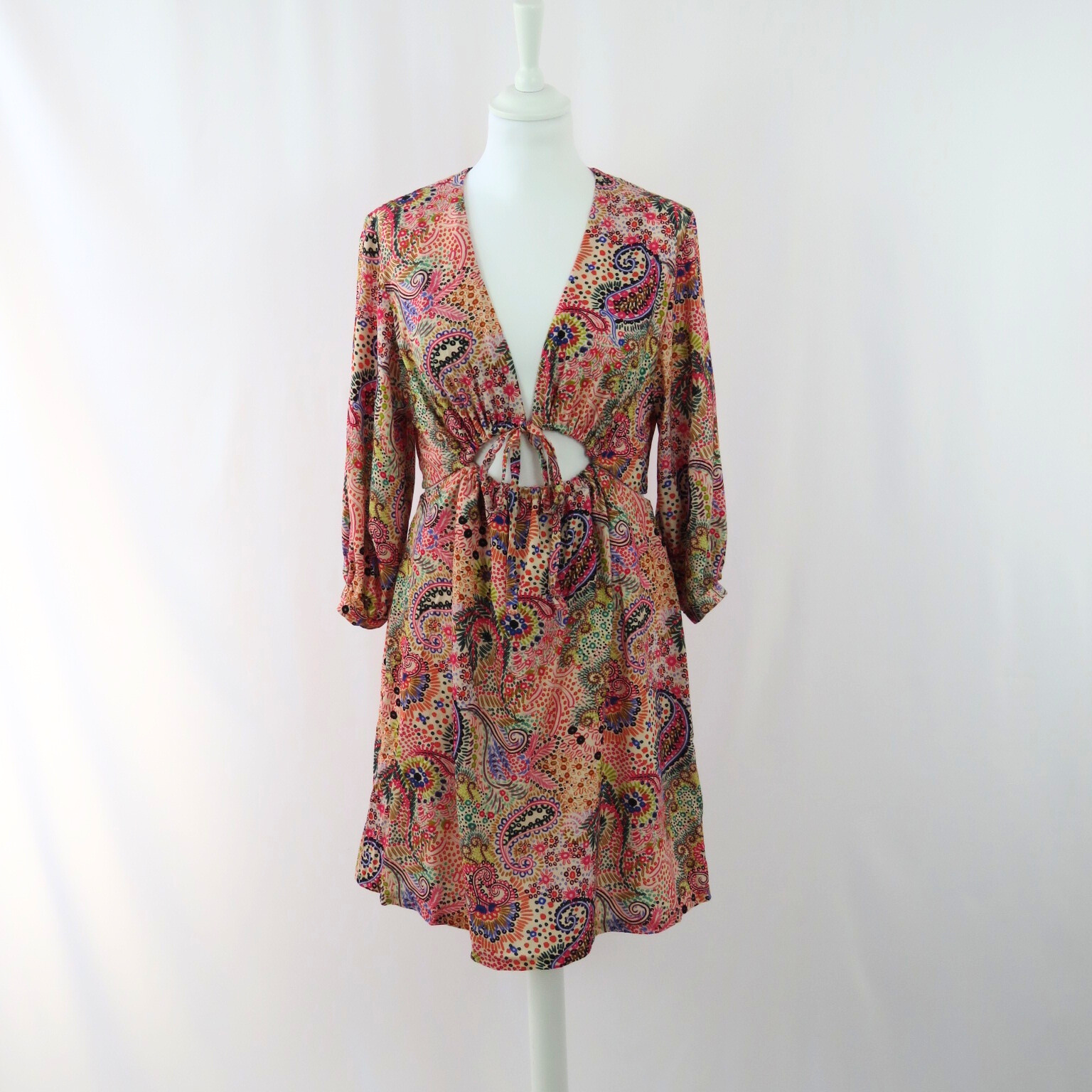Enhance your wardrobe with our stylish waist cut out midi dress. The beautiful drape and colorful paisley print will elevate your look, while the halve sleeves provide a comfortable fit. This unique and eye-catching dress is a must-have for any fashion-forward individual.